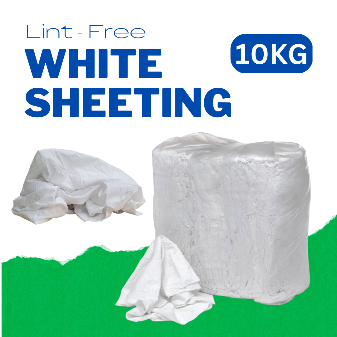 High-quality, hotel-grade, lint-free all-white sheeting for cleaning machinery, hydraulics, and more. Ideal for manufacturers, service engineers, and printers. Sterilized and washed for top performance. White Sheeting rags are designed to be long-lasting and can be washed and reused, which is both cost-effective and environmentally friendly.